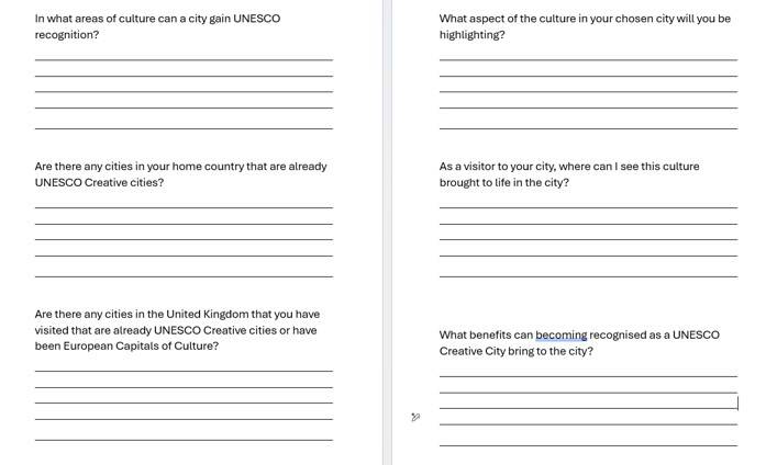 This lead on to a research task around Creative Cities and the chance to think about a city of the student's choice as a UNESCO Creative city.