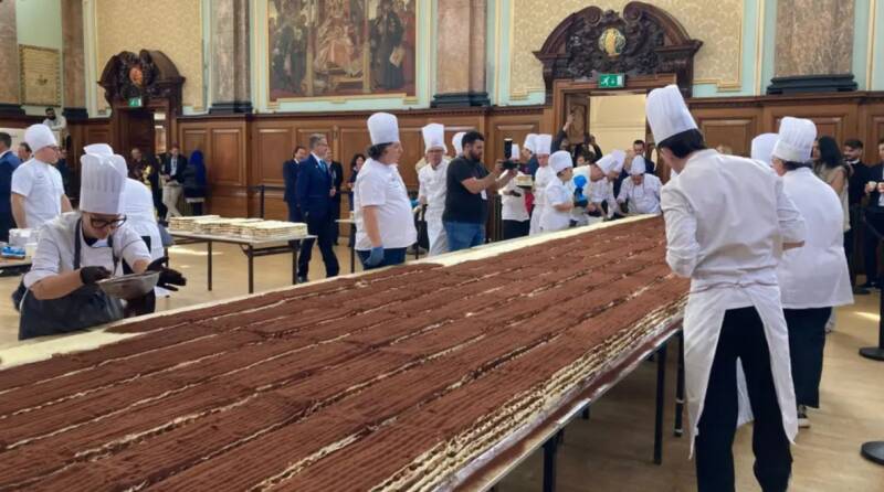 Il tiramisù è un dolce italiano senza cottura, fatto con savoiardi imbevuti di espresso, crema al mascarpone e cacao amaro. Meno male che non richiede cottura, perché il nuovo record ha raggiunto una lunghezza di 440,6 metri ed è stato realizzato da un team di oltre 100 chef italiani, assemblato nella Chelsea Old Town Hall! Tutto doveva essere preparato il giorno stesso davanti ai giudici. https://www.ilfattoquotidiano.it/2026/01/20/il-tiramisu-piu-lungo-al-mondo-sbarca-a-londra-oltre-300-metri-sotto-la-supervisione-dei-giudici-del-guinness-world-records-sara-dedicato-a-re-carlo-e-camilla/8262822/