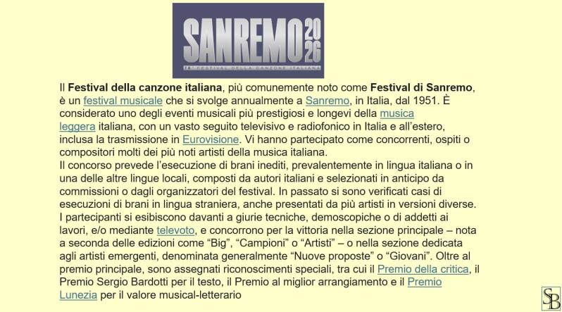 With one student over a number of weeks, we watched clips in the run up to the San Remo festival 2026. This included seeing some of the pop-up concerts and flash-mobs in various cities around Italy, we read some background about the festival, as well as hearing artists talking about the pieces they were bringing to the festival. Lastly, we enjoyed the winning song, there's a YouTube link below for you to enjoy it too! It really was much more catchy as tunes go than some of the other competitors.